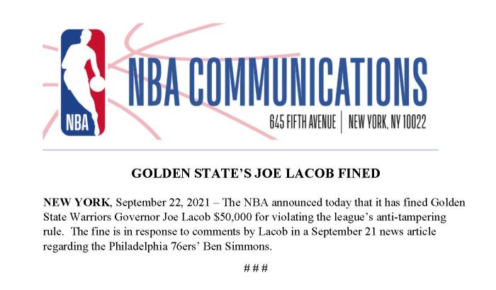 有谁能想到勇士老板成为西蒙斯闹剧中第一个被联盟罚款的人?如果没有记错的话,这应该是今年休赛期的第一笔NBA罚单。