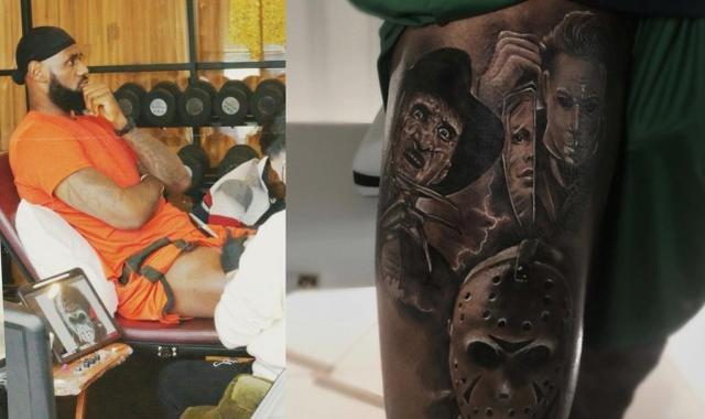 赛前,詹姆斯终于揭晓了此前自己纹身的内容,相信应该还有很多球迷记得就是那一天詹姆斯硬生生把皇冠纹成了小山送给自己的纹身师,偏偏纹身师傅还要走出一副高兴的样子。相对于詹姆斯的手艺,今天詹姆斯曝光了纹身师的作品:《猛鬼街》里面的杀手弗雷迪,《月光心慌慌》中的麦克、《十三号星期五》中的水晶湖杀手杰森,詹姆斯管他们叫三巨头,老詹新纹身图案曝光后,也迅速引发了球迷的热议和点赞,不少球迷除了表示詹姆斯的腿粗之外,更表示这组图案简直是自己的童年噩梦。