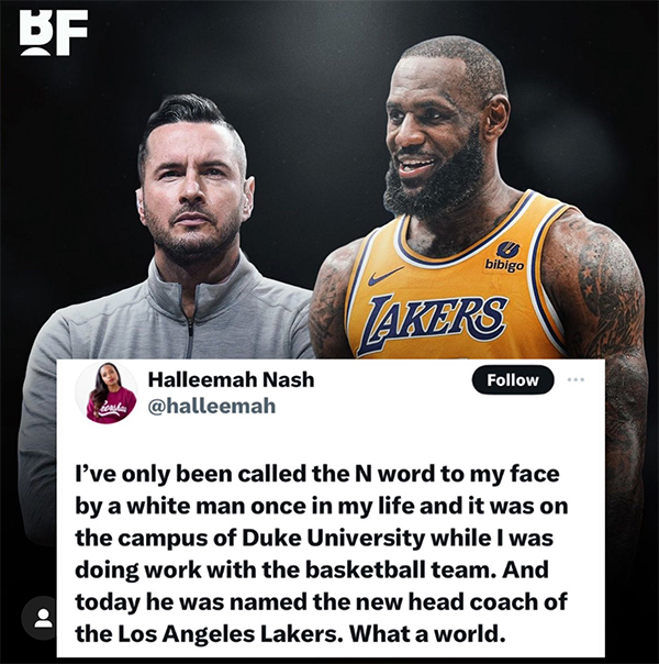 作家、演说家、杜克大学校友哈莉-纳什公开指控雷迪克种族歧视,今日发推写道:我这一生只被白人当面骂过一次“N 字”,那是在杜克大学校园里,当时我正在和篮球队一起工作,如今他被任命为洛杉矶湖人队的新任主教练,真是个疯狂的世界。