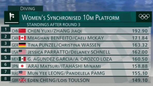 第三轮,张家齐和陈芋汐107B,3.0的难度系数,得到81.90分,总分192.90分稳居第一。加拿大171.84分第二,德国163.32分第三。