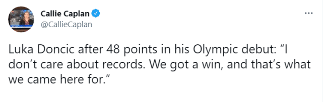 他创造了奥运首秀的球员得分纪录,还创造了NBA球员在奥运会的得分纪录。在奥运会历史上,48分能排在单场得分的第二位,仅次于奥斯卡-施密特的55分。他成为奥运男篮史上第6位能单场轰下至少40分的球员,也是奥运男篮史上第13次出现单场40+的表现。东契奇还是唯一一位在奥运赛场和NBA赛场都砍下至少45分的球员。