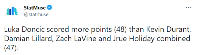 StatMuse还通过和美国男篮的首秀对比,看看东契奇有多么可怕。“杜兰特、利拉德、拉文和霍乐迪在首战一共得到47分,而东契奇一人得分就达到48分,比他们的总和还高。”