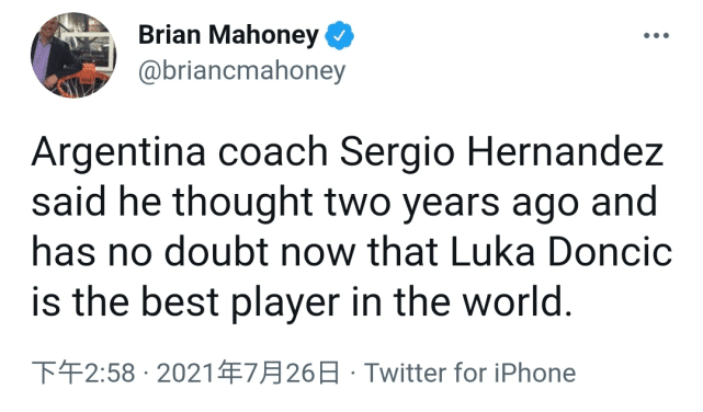 阿根廷主帅塞尔吉奥-埃尔南德斯猛夸东契奇:“他刚刚摧毁了我们,他就是世界上最好的球员,包括NBA在内。如果我之前还有一些疑虑的话,现在也没了。”埃尔南德斯承认,自己两年前就觉得东契奇是世界上最好的球员,而现在自己认为这一结论更是毫无疑问了。