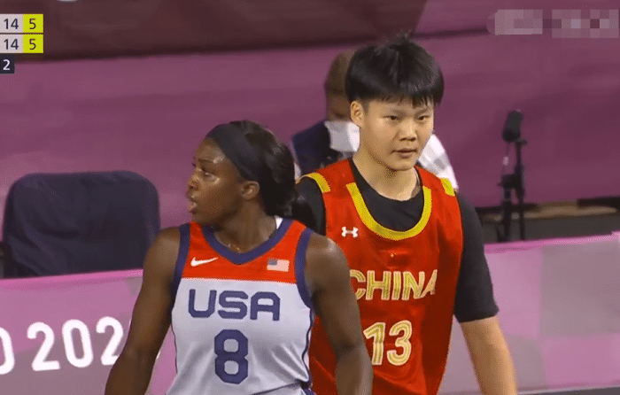 美国队大名单:5号普拉姆、8号杨、13号道尔森、15号格雷、中国队大名单:6号杨舒予、10号张芷婷、13号万济圆、23号王丽丽。比赛开始后,格雷接队友传球上篮命中,杨舒予突破上篮得分回应,杨舒予弧顶的远投也有,道尔森篮下勾手命中,普拉姆突破上篮造杨舒予犯规,普拉姆罚球命中,开局两队打成了3:3平。
