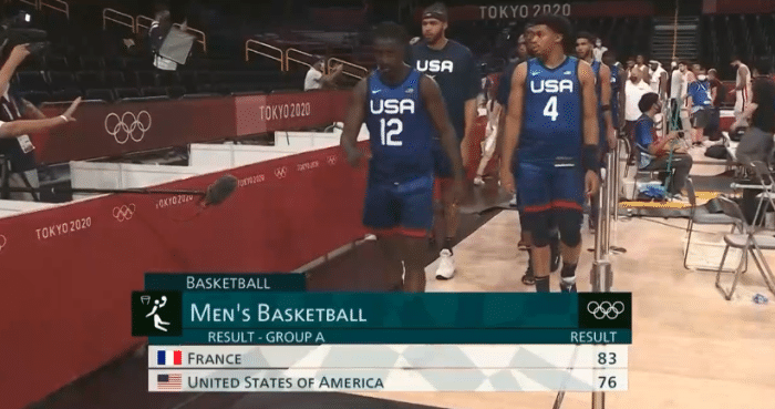 来源:24直播网07-26 10:0024直播网讯 北京时间7月25日,美国男篮东京奥运首战不敌法国,第三节11-25狂输14分被翻盘,末节一度再次领先,可关键时刻美国男篮集体掉链子,最后1分钟杜兰特、霍勒迪和拉文共计投丢四记续命三分,利拉德滑倒失误还赔上违体犯规,美国男篮遭遇耻辱一战。