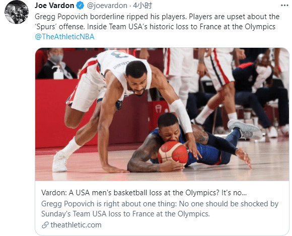 据名记Joe Vardon报道:波波维奇被自己的执教战绩吓到了,他很在意那些失利,非常难受。美国队的球员们也非常失望,返回更衣室的路上,他们抱怨波波维奇在美国队仍然使用马刺的进攻体系,他们认为有更好的打法。