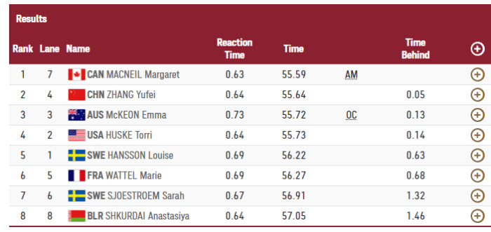 张雨霏在预赛、半决赛和决赛都游进56秒以内,本届奥运会唯一一位在该项目中连续三场游进56秒以内的选手;决赛游出55秒64的好成绩,比第一名55秒59仅仅只差0.05秒。