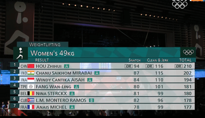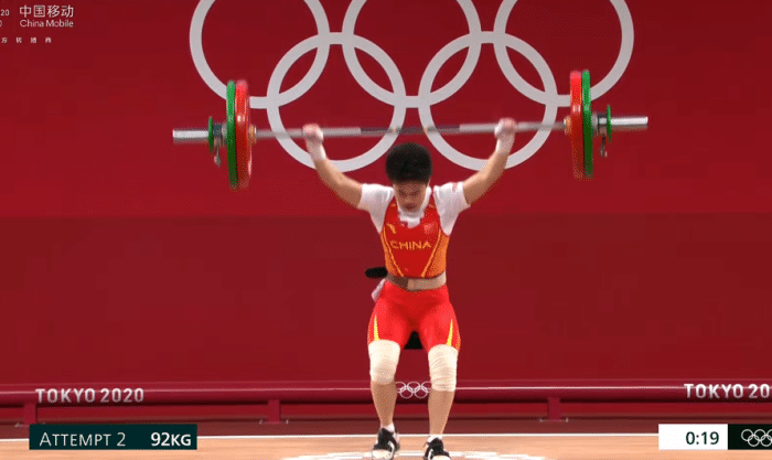 侯志慧动作干脆利落,一气呵成,而且整个发力动作非常连贯!第三把试举增加2公斤,提升到94公斤,再次轻松过,感觉她完全可以挑战更高啊!抓举全部结束,侯志慧遥遥领先第二名印度选手米拉拜7公斤!这几乎可以确定将金牌收入囊中!而值得一提的是,侯志慧也是抓举世界纪录保持者(96公斤)