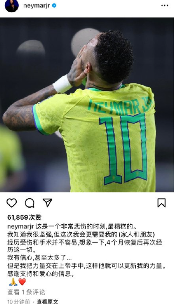 连续重伤!内马尔首度发声,感谢梅西等人支持,会坚强有信心