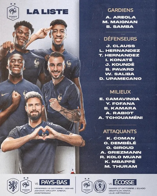 法国队将在10月迎来与荷兰的欧预赛,以及与苏格兰的友谊赛。
