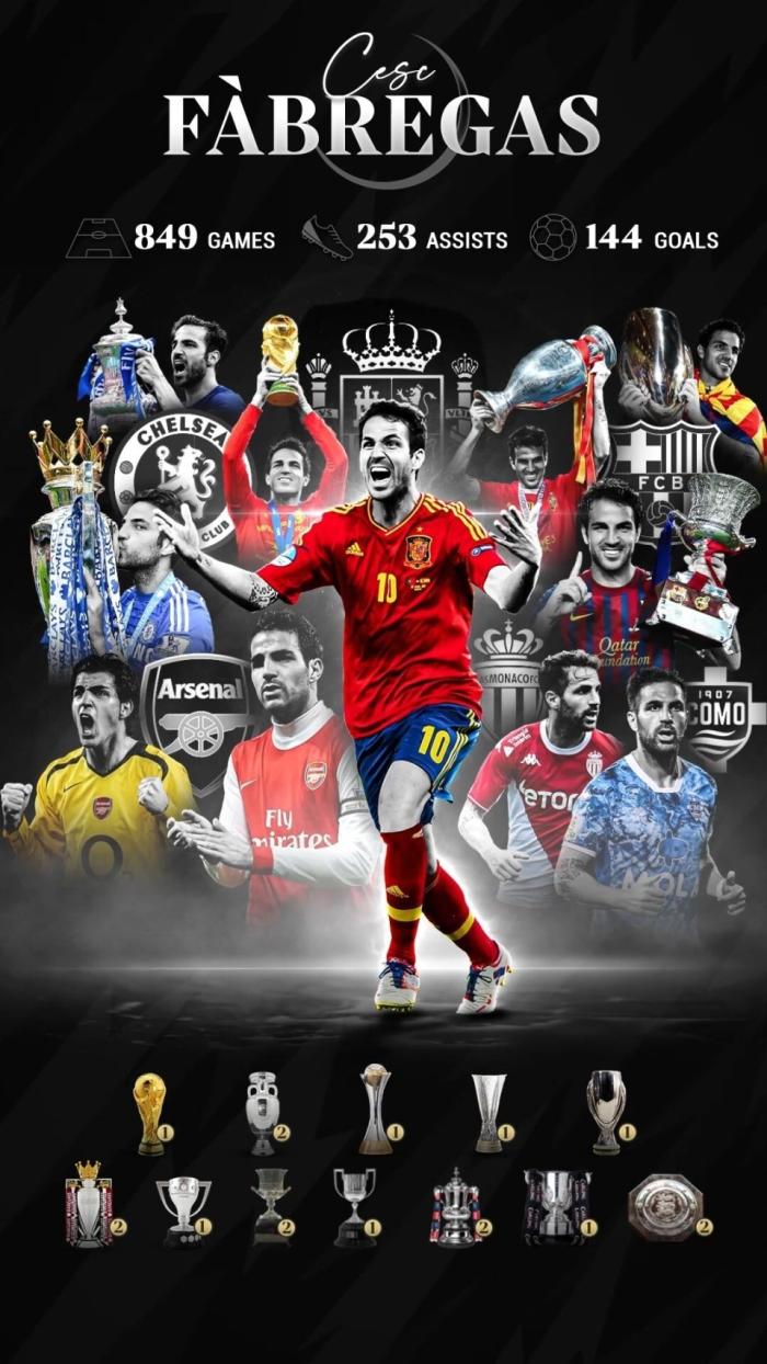 现年36岁的法布雷加斯,出道于拉玛西亚青训。此后辗转效力阿森纳、巴萨、切尔西、摩纳哥、科莫等队。他曾以16岁零177天,成为阿森纳队史出战正式比赛最年轻的球员。他共为球队出场303次,帮助球队赢得一座足总杯冠军和2个社区盾杯冠军。
