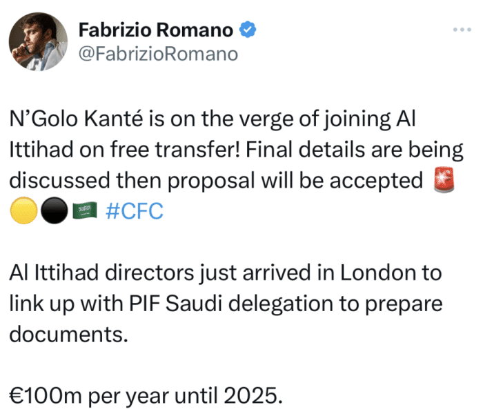 罗马诺透露,双方正在讨论合同细节,吉达联合总监抵达伦敦,与PIF沙特代表团会和,准备合同文件。据悉,坎特将获得1亿欧元年薪,这1亿欧元包括了肖像权费用和商业交易,以及一项创意的“投资组合(investment portfolio)”收益。双方将会签约2年,签约至2025年。