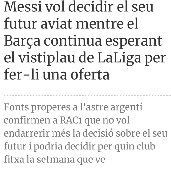 正因为此,梅西尽管满意巴萨对自己的这份“非正式报价”,但他还没有确定接受哪一份报价,未来几天他会和自己的家人还有团队深入研究后,再对外宣布自己的最终决定。