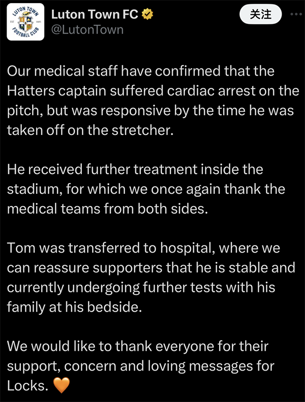卢顿官方晕厥队长恢复意识,情况稳定已送医,赛中曾心脏骤停