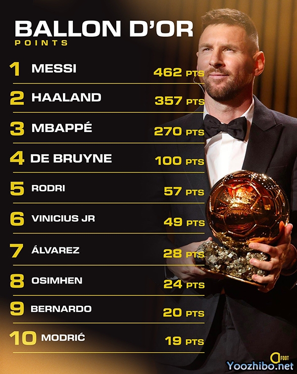 金球奖前十名得分:梅西462分夺魁 领先第二哈兰德105分