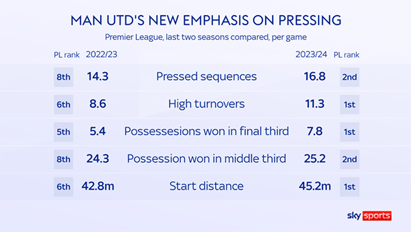 英国天空体育的数据显示,曼联的高位逼抢有一定收效,在前场抢回球权的数据在英超名列前茅。但是,曼联的紧逼并没有完全达到滕哈格想要的效果,球员在前场无法始终遏制对手。