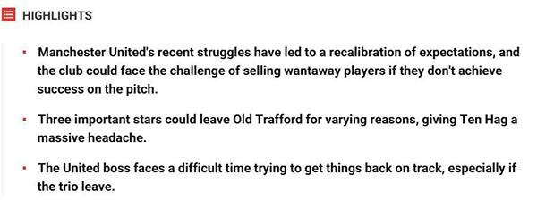 然而,随着滕哈格改打传控足球,B费的进攻稳定性遭到了质疑,他喜欢冒险传球,经常丢失球权,这更适合快速反击打法,而与新的战术风格有些出入。而且,如果曼联无法满足B费夺取更多冠军的雄心壮志,他若转会其他顶级豪门,也是可以理解的做法。