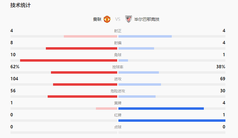 全场比赛结束,曼联1-1毕尔巴鄂竞技。