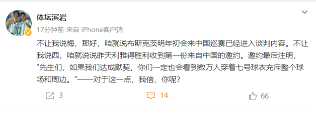 如今相关的报道来袭,知名足球人、经纪人滨岩透露,不说梅西只谈布斯克茨,指的是迈阿密国际,明年初会来中国巡赛已经进入谈判内容。利雅得胜利收到第一份来自中国的邀约,邀约最后注明:“先生们,如果我们达成默契,你们一定也会看到数万人穿着7号球衣充斥整个球场和周边。”