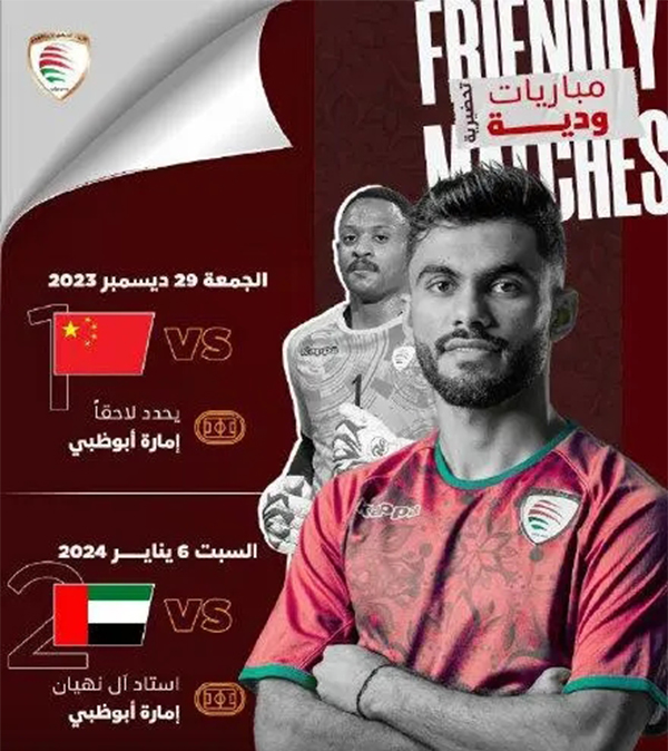24直播网12月20日讯,阿曼国家队官方公布了两场热身赛的时间:12月29日阿曼将对阵中国队,1月6日阿曼对阵阿联酋队。